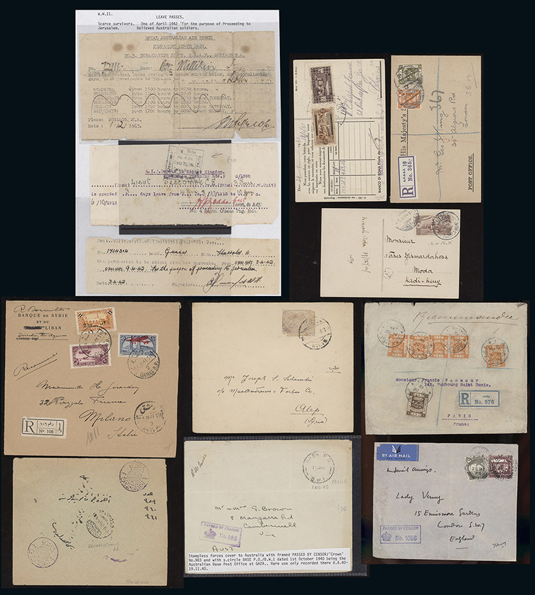 140 c, entire, etc. imagePostal History and Covers: A selection of Middle East covers and postal stationery, incl. Ottoman with 1921 Kilis local on cover to Aleppo (faults), Palestine with W.W.II censored and soldier leave passes, Syria, etc. (33) (Image1)