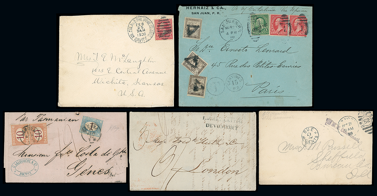 131 c, entire, etc. imagePostal History and Covers: A selection of covers, incl. Mexico 1846 (Sept.) reduced entire letter to London with “PACKET LETTER/DEVONPORT” mark, part content regarding the Mexican-American “We have had no positive news yet of the progress of the Americans towards Monterrey; all we know is that they are moving 7000 men in three columns upon said place whilst the Mexican Forces about 5000 men are hurrying to defend it”, Haiti 1872 entire letter to Genoa with Italy postage due 10c. pair and 1l., 1898 Spanish-American War unpaid cover to U.S.A. with “U.S.S. Cincinatti” and “DUE/2/CENTS” marks, Philippines 1900 cover to Kansas with “MIL. STAT. No.2 PHILIPPINE ISLANDS/CAVITE” duplex and Puerto Rico 1901 cover to Paris with French postage dues. (5) (Image1)