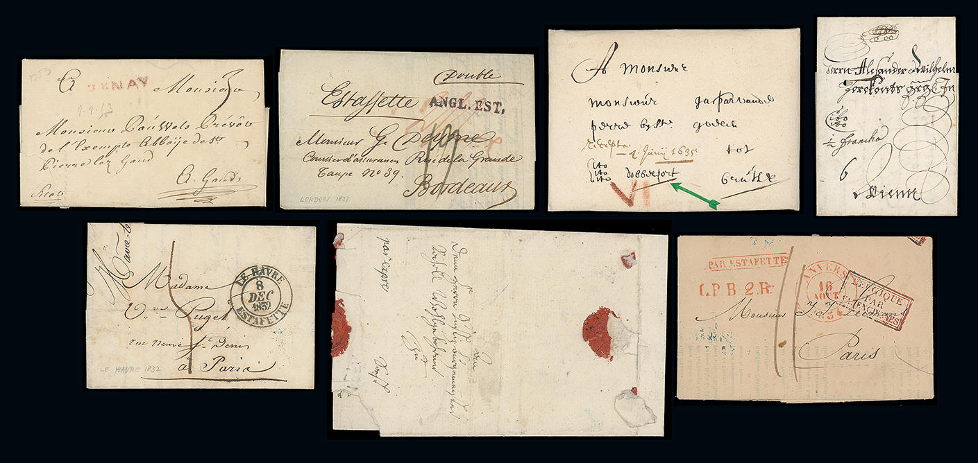 125 c, entire, etc. imagePostal History and Covers: An all World selection of mostly pre-stamp covers, 1799 to 1896, incl. three early covers from Batavia to France with “ZEE. BRIEF” ship marks, two forwarded, Portugal, Egypt, Ionian Is., Cuba official, Gibraltar 1874 soldier’s letter with G.B. 1d., Saint Lucia early covers, 1896 cover from Funchal to Rhodesia with military address and T.P.O., etc. (17) (Image1)