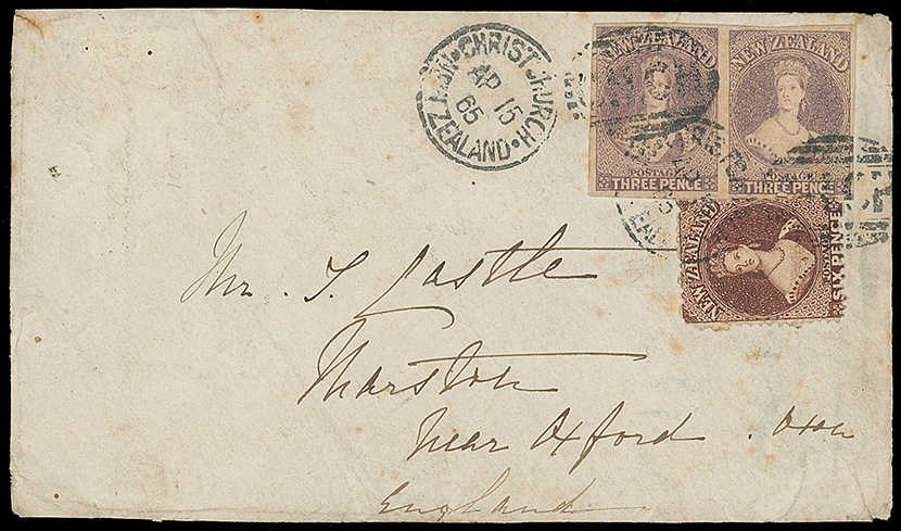 New Zealand: Cancellations and Covers: 1865 (Apr. 15) envelope front (only) to England franked 3d. imperf. pair, four margins and slightly overlapped 6d. perf. 121/2 tied by two “CHCH” (Christchurch) duplexes,