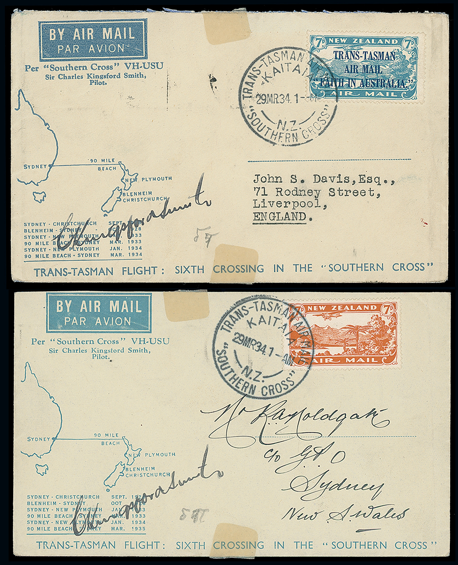 New Zealand: 1934 (Mar.) 6th Trans-Tasman printed flight covers to Sydney or Liverpool each franked 7d. (one with Trans-Tasman) overprint) and each tied by “KAITAIA” dated cachets and signed at left by