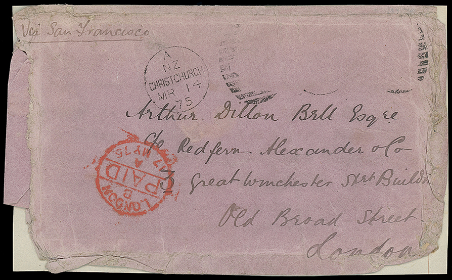 New Zealand: Crash and Wreck Mail: 1875 (Mar. 14) defective envelope “via San Francisco” to London (all three stamps missing) and with part Christchurch duplexes. Carried on the “Schiller” from New York to Hamburg