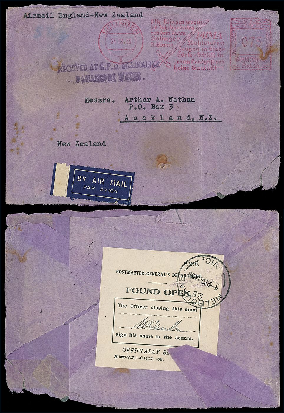 New Zealand: Crash and Wreck Mail: 1935 (Dec. 24) defective airmail envelope to Auckland with German 75pf. meter franking and Solingen c.d.s. with “RECEIVED AT G.P.O MELBOURNE/DAMAGED BY WATER” mark at top and