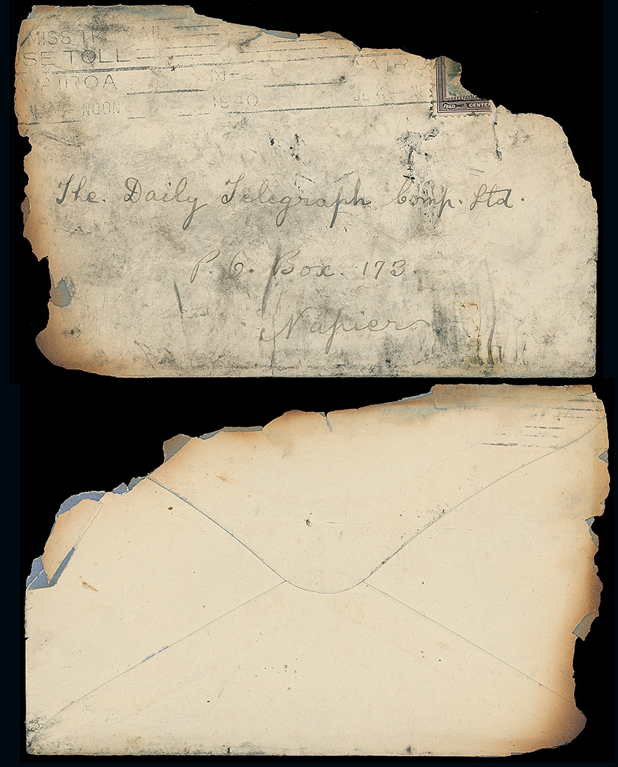 cuttings. Carried on the “Kahu” from Auckland to Gisborne, crashed in turbulent weather. The mail fully recovered though this the only example recorded from the incident. Photo. (Image1)