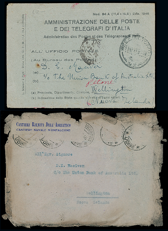 New Zealand: Crash and Wreck Mail: 1946 (Dec.) defective envelope to Wellington from Udine (Italy) all five stamps missing and with 1947 (Jan. 30) official printed ‘ambulance’ envelope with three-line cachet