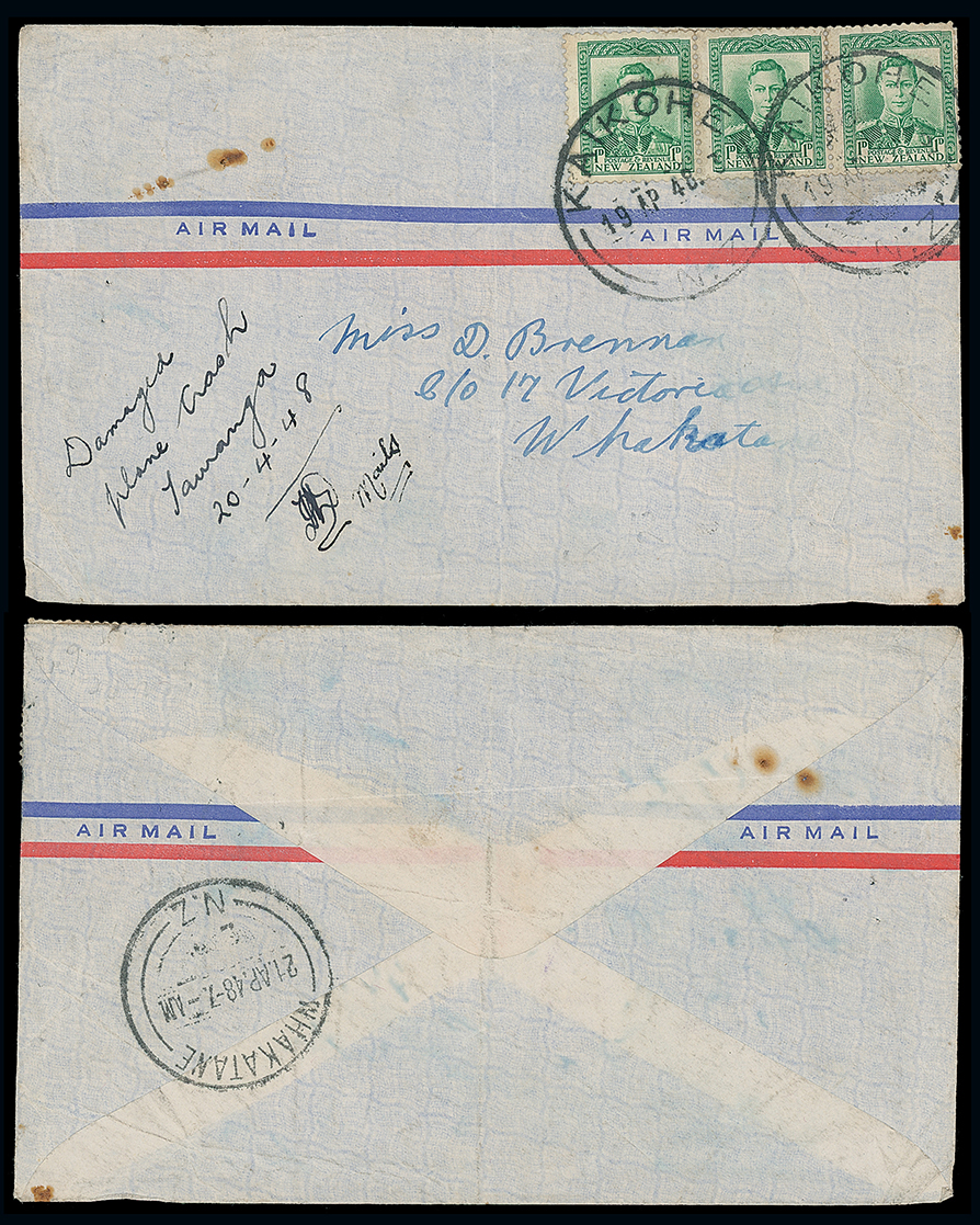 New Zealand: Crash and Wreck Mail: 1948 (Apr. 19) airmail envelope to Whakatane franked 1d. (3) tied by Kaikohe c.d.s. and endorsed “Damaged/plane crash/Tauranga/20-4-48” at left, also a few contemporary newspaper
