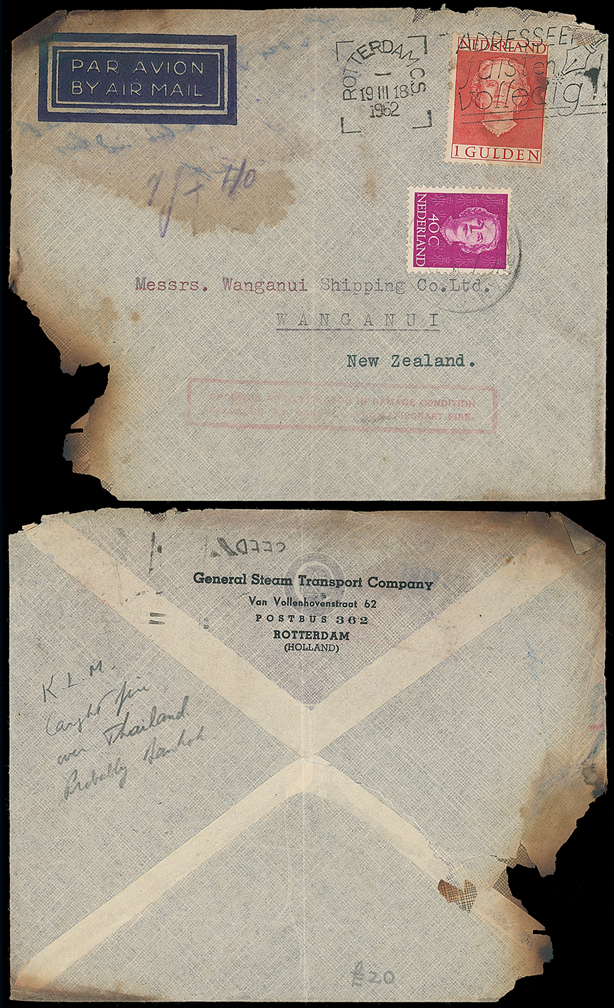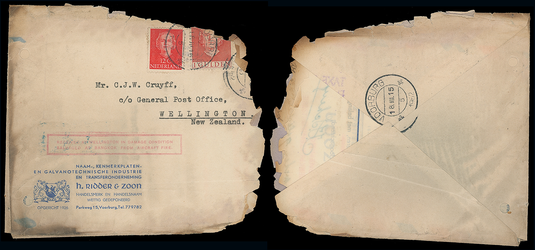 New Zealand: Crash and Wreck Mail: 1952 (Mar. 19) stained charred airmail envelope to New Zealand franked Netherlands 40c. and 1g. tied by Rotterdam machine cancellation or c.d.s., with framed “RECEIVED AT
