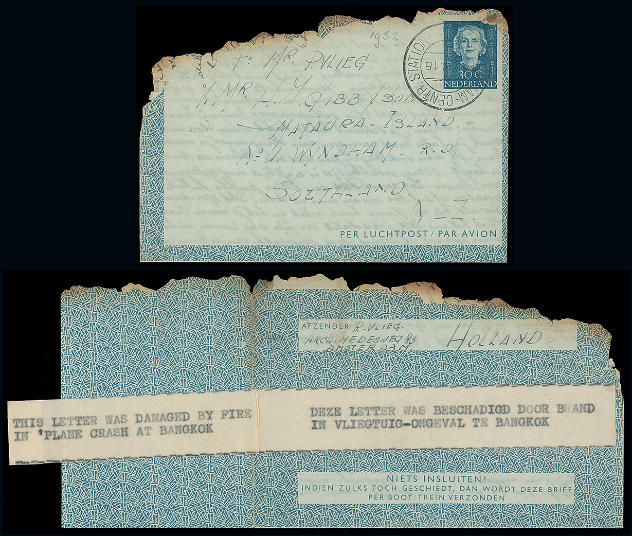 New Zealand: Crash and Wreck Mail: 1952 (Mar. 19) stained charred Netherlands 30c. aerogramme to New Zealand from Amsterdam, framed “RECEIVED AT WELLINGTON IN DAMAGED CONDITION/SALVAGED AT BANGKOK FROM AIRCRAFT