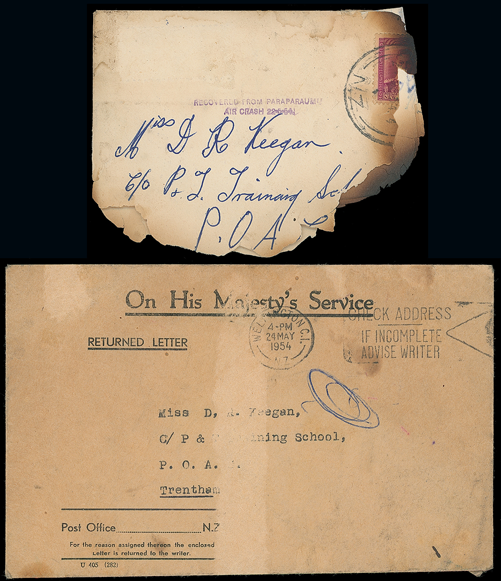 matching O.H.M.S. “RETURNED LETTER” envelope to the addressee. Carried on N.Z. National Airways Corporation “Piere” crashed on approach to Wellington airport. Ten examples recorded also some contemporary photos of the crash site, airport or loading