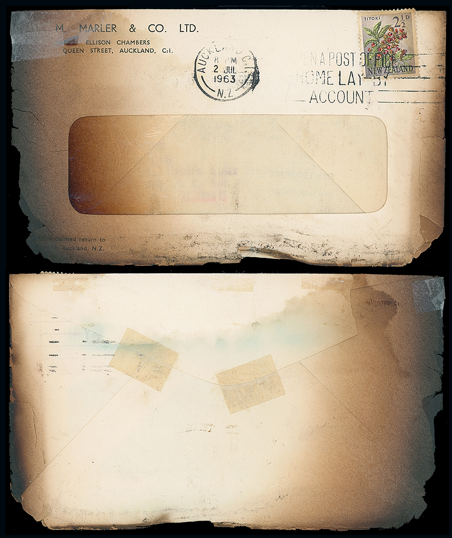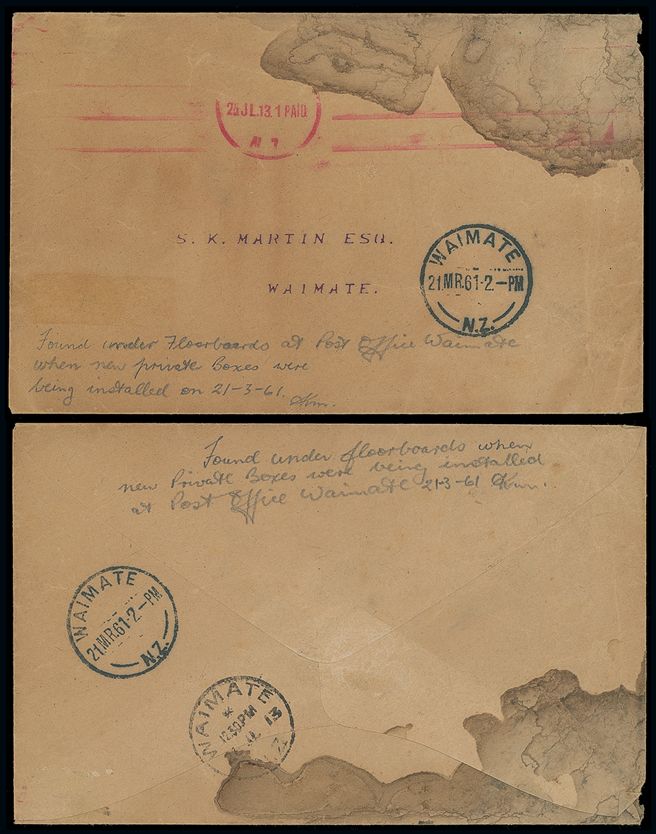 New Zealand: Crash and Wreck Mail: 1961 (Mar. 21) stained envelope with part machine cancellation dated “25 JL.13” and endorsed “Found under floorboards when/new Private Boxes were being installed/at Post Office