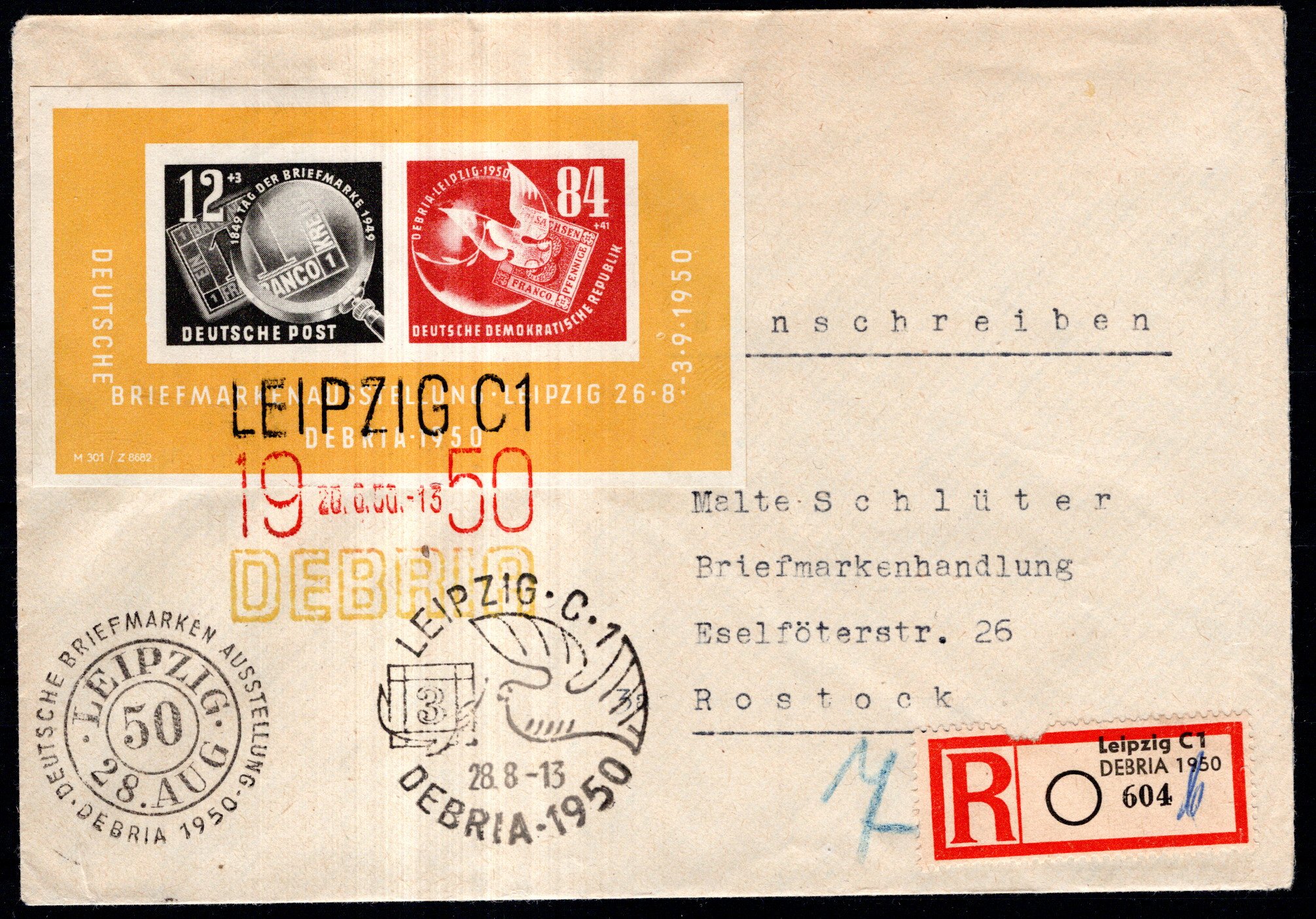 R-Brief nach Rostock (rücks. Ank.Stpl.), Brief zeigt drei verschd. Sonderstpl., Kab. (Image)