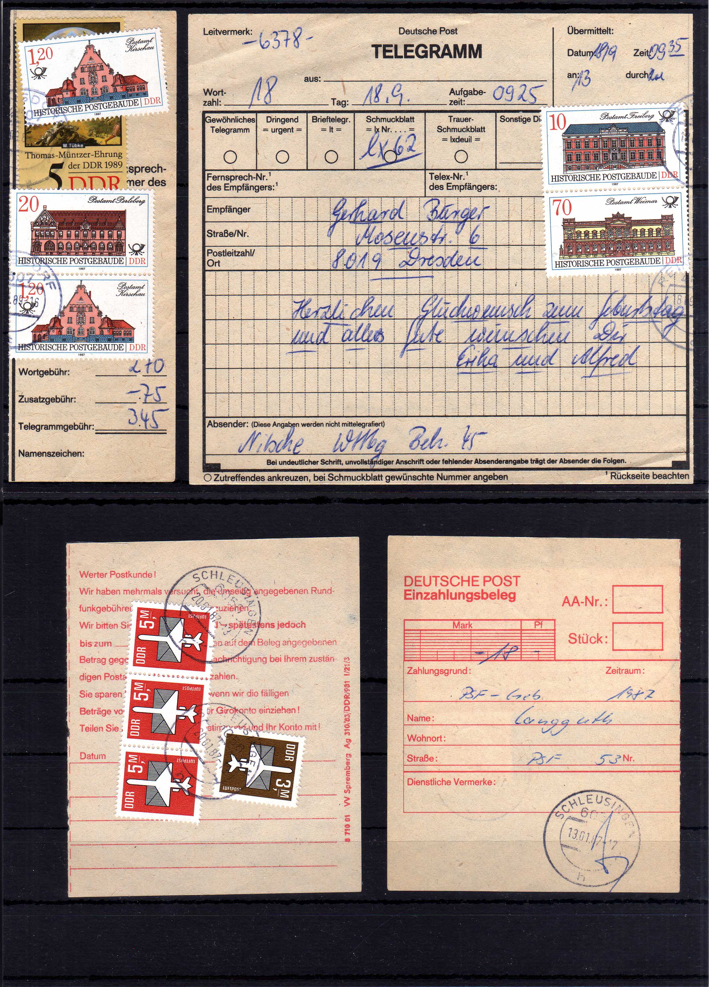 3069 bzw. 3246(3) auf zwei frankt. Telegrammen, ferner drei frankt. Sammlerausweise bzw. Zahlg.Abschnitte u. 1 frankt. Auflieferungsseite (Image)