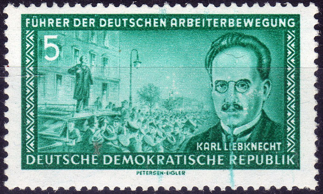 Grüner Farbstrich vom unteren Rand bis Kinn von Liebknecht, dekorat. Abart (Image)