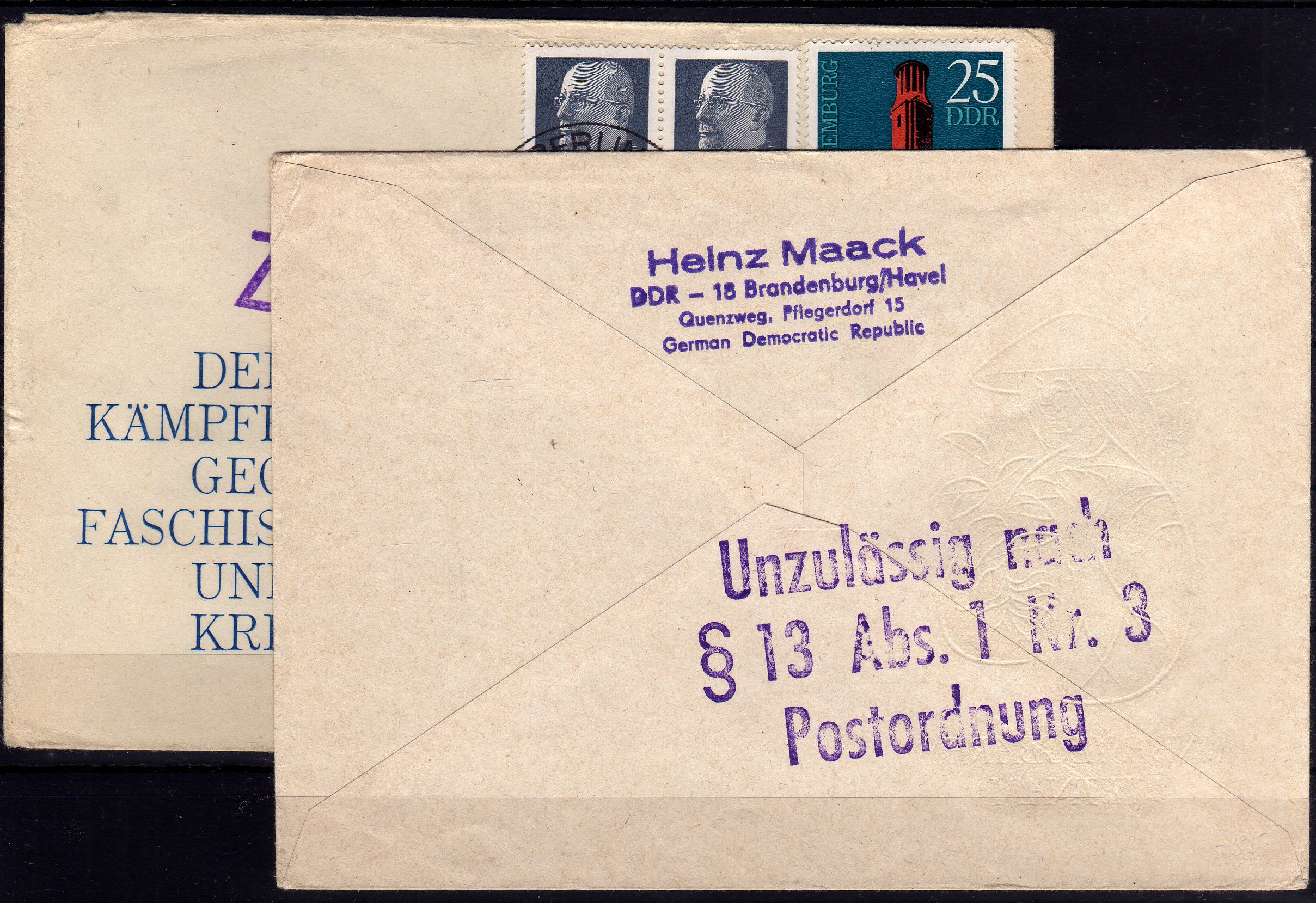 4401 imageDDR FDC 1699 u. 1705 (Mi.B.1.d u. e) je mit vorderstg. "Zurück" Vermerk bzw. "Unzulässig nach §13...", Kab. (Cat Value 400) (Image)