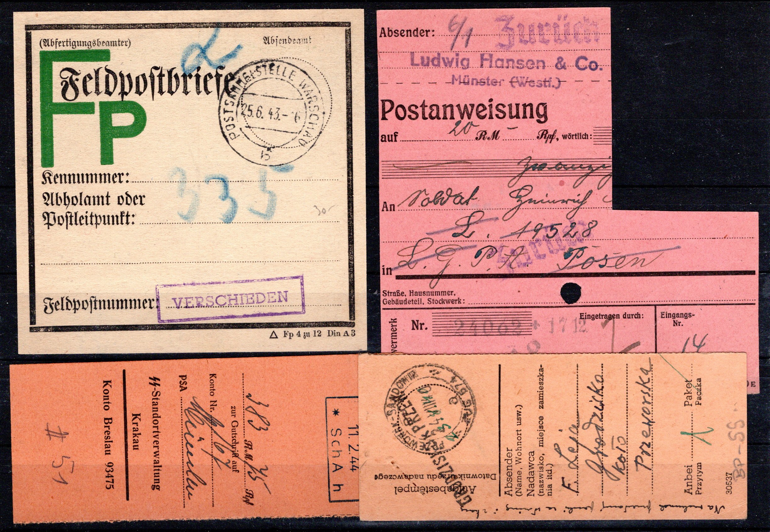 vier verschd. gebr. Postdokumente, dabei Vorbindezettel, je ein Einliefererabschnitt für ein Paket bzw. Feldpostanwsg. (SS) und eine Teil-Postanweisung (Image)