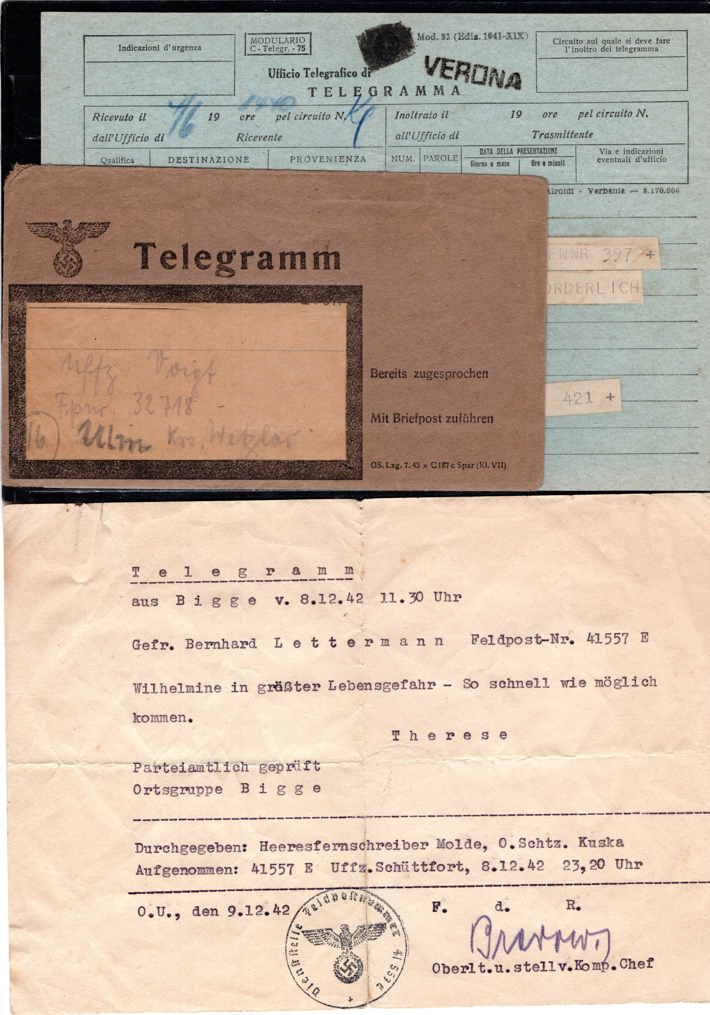 Feldposttelegramme im dazugehörigen Vordr.Umschlag auf ital. Telegrammkarte bzw. als Abschrift mit Briefstpl. (Image)