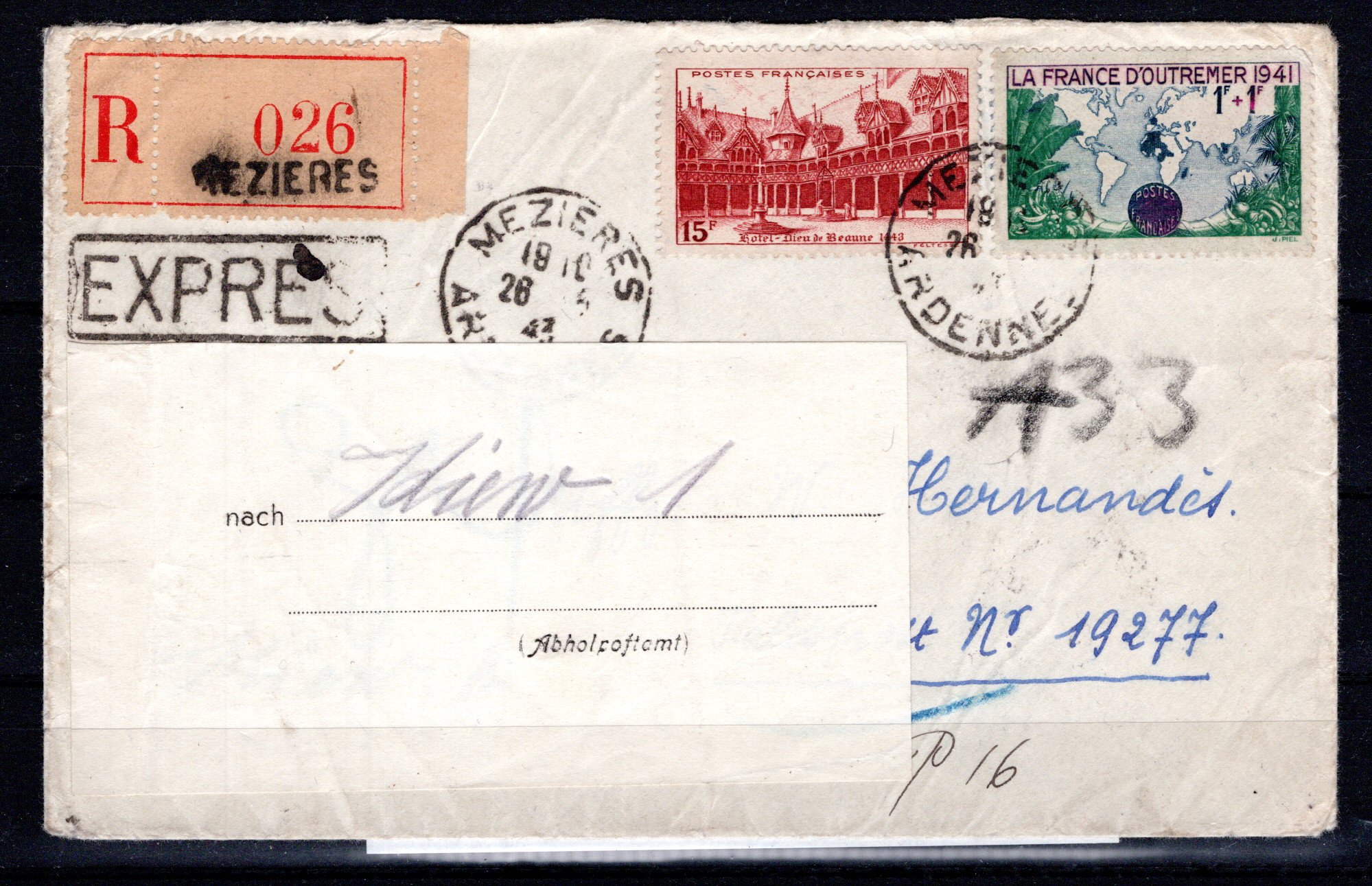 Besondere Nutzer Frankreich, frankt. Express-R- aus Mezieres via Paris (rücks. vier verschd. Transitstpl) an Unt.offz. W. Hernandés FP-Nr. 19277, zusätzl. vorders. angebrachter Zettel "nach Kiew 1"