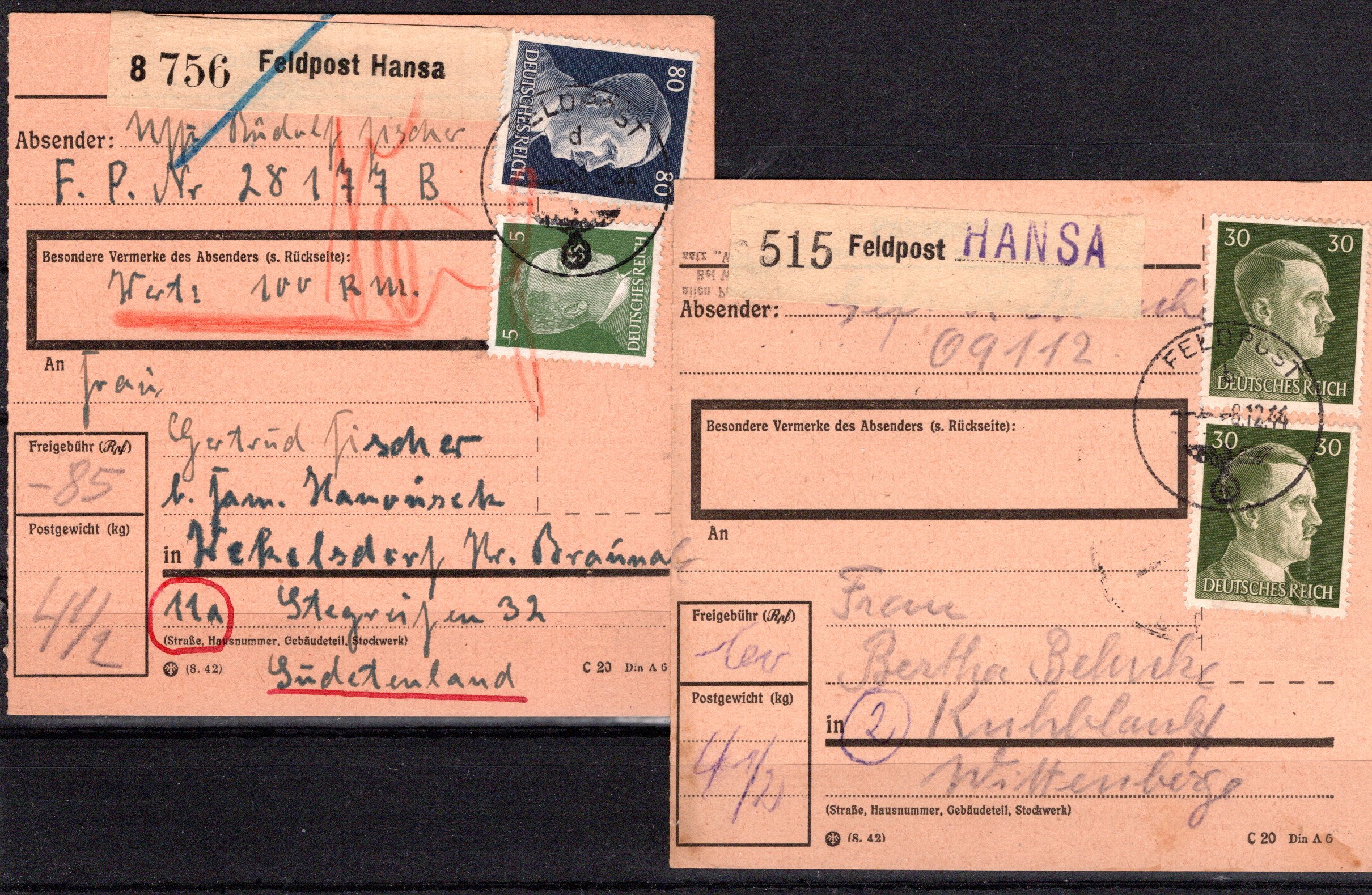 private Paketkarten (frankt.) je mit unterschdl. Paketnr.Zettel "Feldpost Hansa", davon einmal ins Sudetenland, selten (Cat Value 400) (Image)