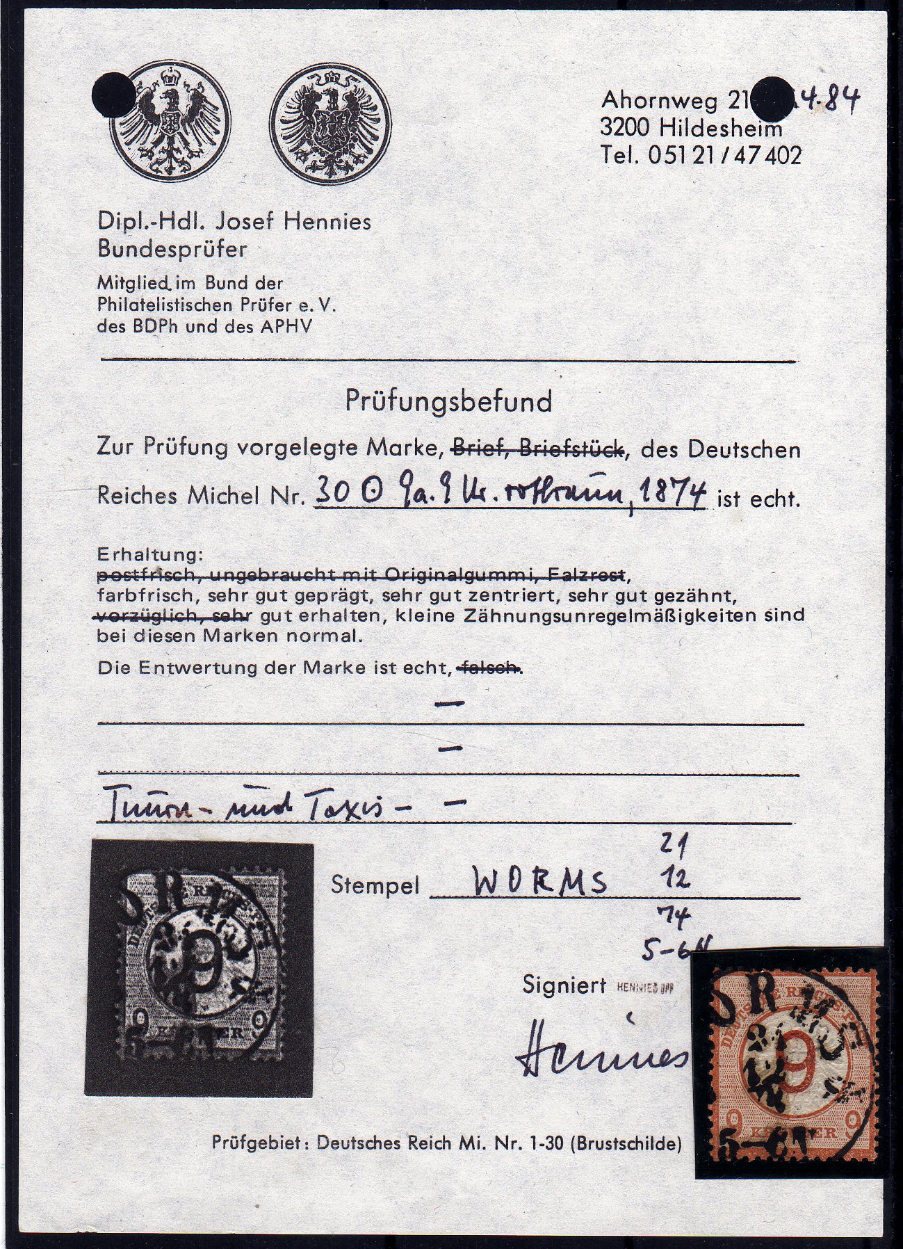 nachverwendetem Th.&Taxis-Stpl. "Worms" u. Fotobefund Hennies, Kab. (Cat Value 650) (Image)