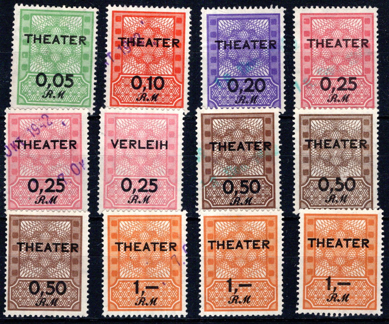 Gebührenmarken 0,05 - 1 RM mit Aufdruck "Theater" in 6 verschd. Wertstufen bzw. Farben, alle auf Württbg.-Wz Papier (Wz.1) (Image)