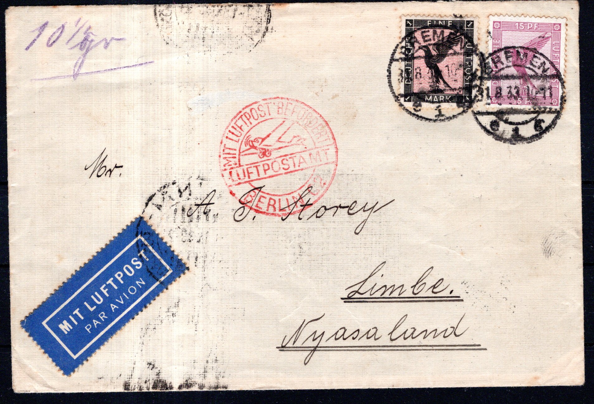 A379 auf Lp-Brief (roter DKr.Stpl.) nach Limbe-Nyasaland, sicherl. selt. Destination, div. Transit-/Ank.Stpl. (Image)