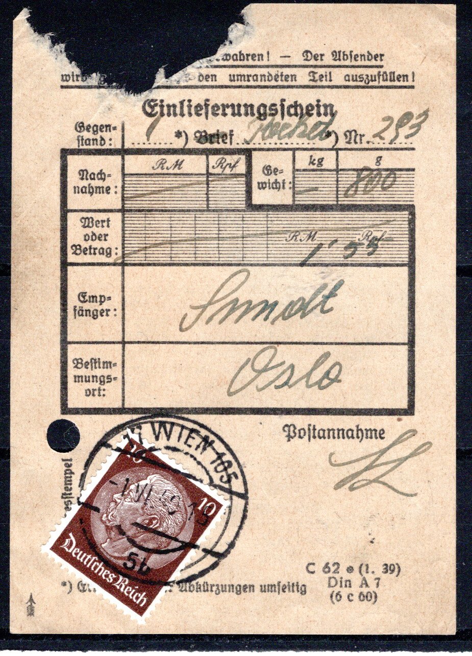 EF auf Einlieferungsschein für 1 Paket von Wien nach Oslo, kl. Teil des Zettels oben fehlend, 1 Ablageloch (Image)
