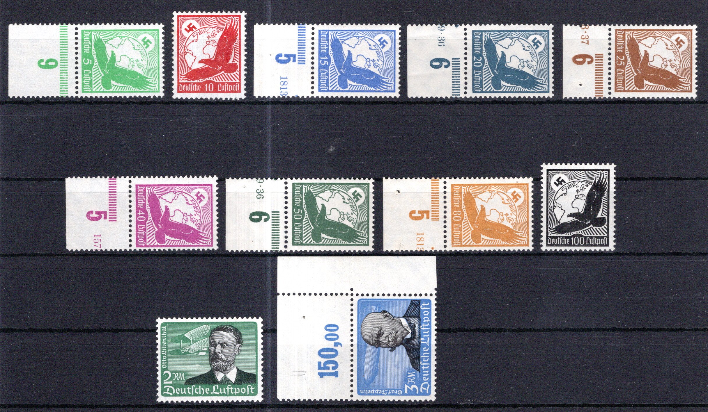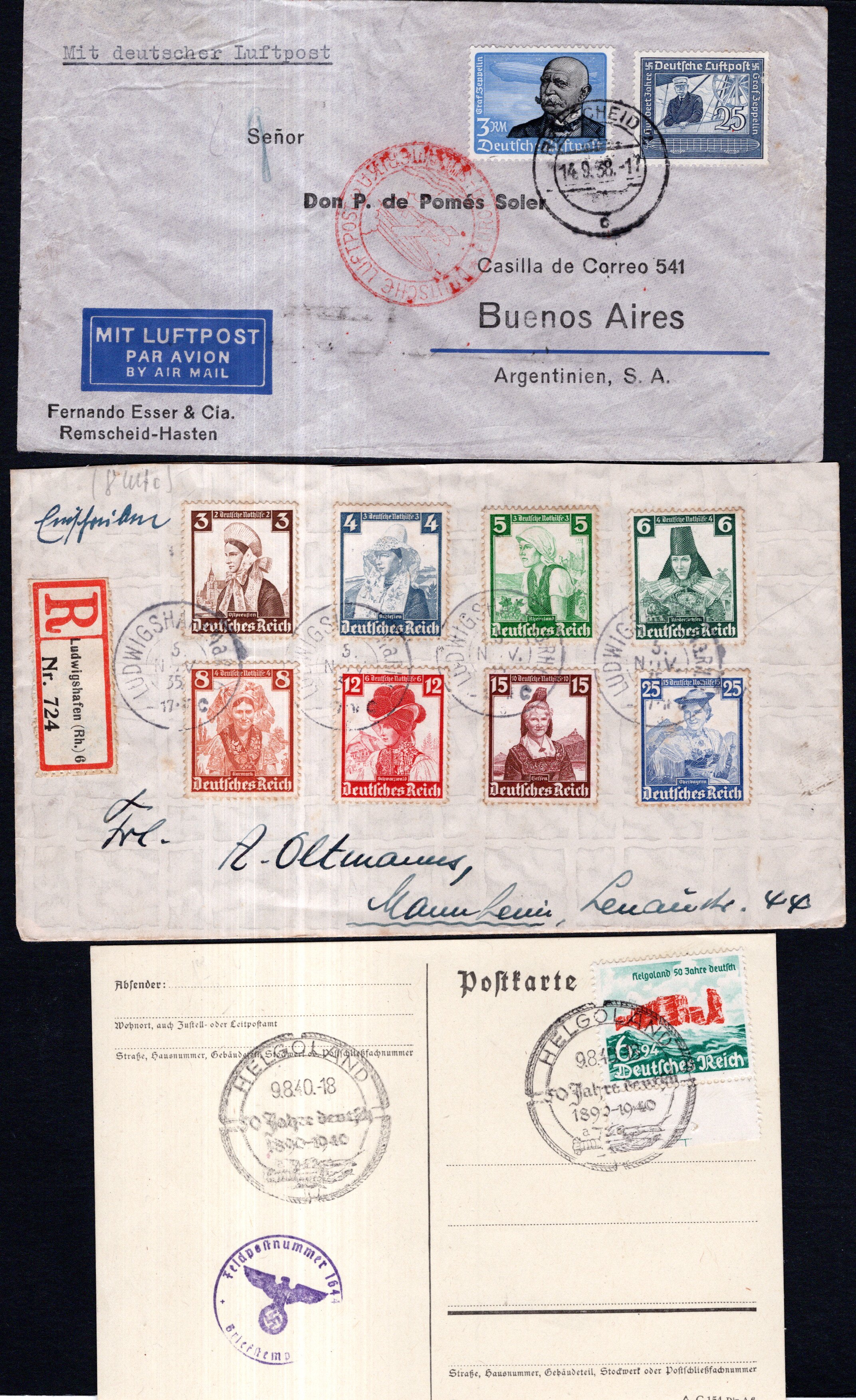 ZuF auf Lp-Brief nach Buenos Aires, dazu 7 weitere Belege, u.a. 671 auf R-Brief, 695-97 auf Briefvorders. etc. (Cat Value 470) (Image)