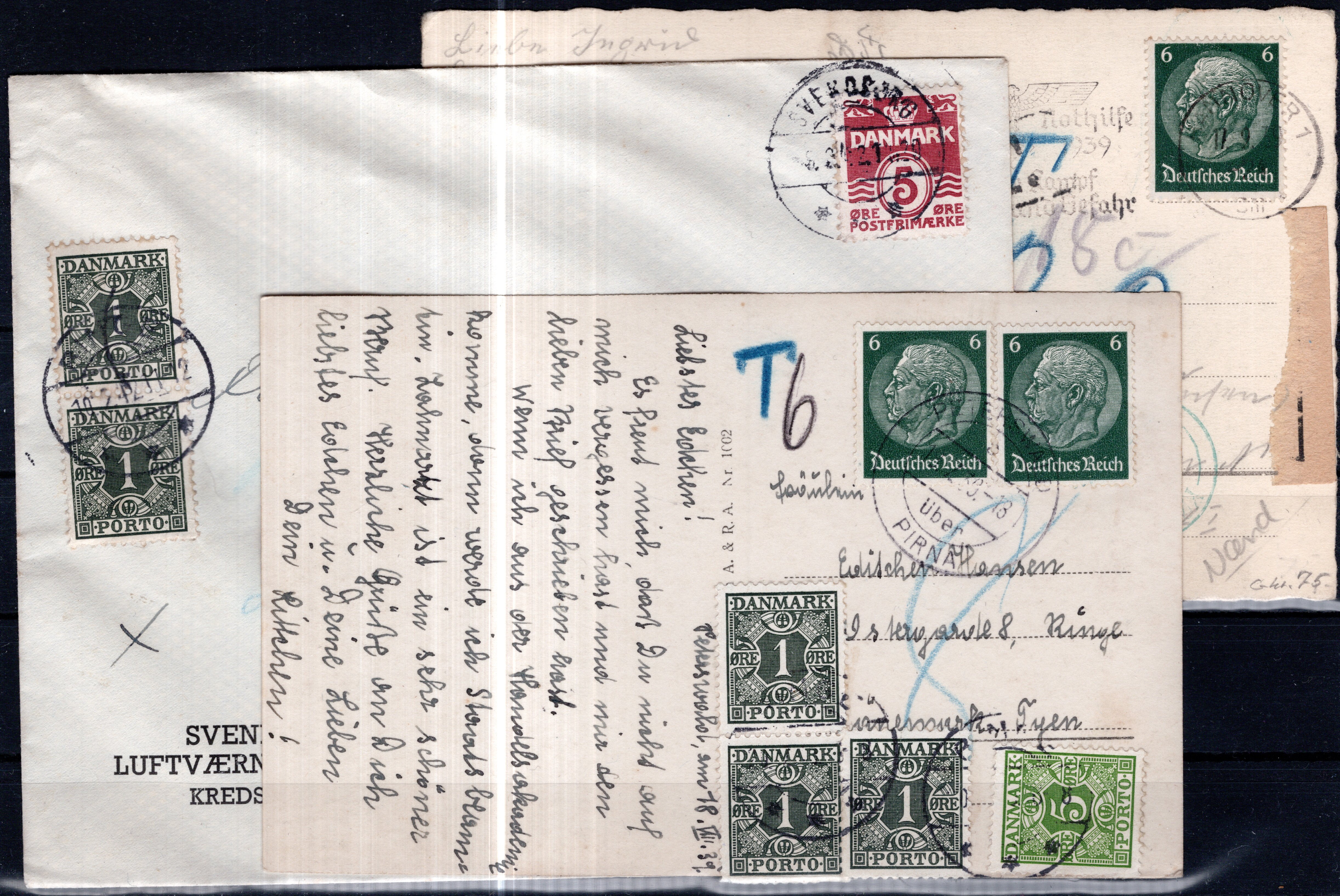 eine EF bzw. MeF nach Dänemark mit Nachporto (MeF mit dän. Portomarke) belegt, dazu ähnl. dän. Inlandsbeleg (Image)