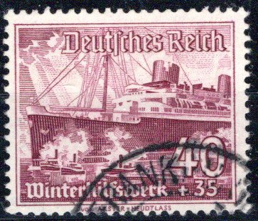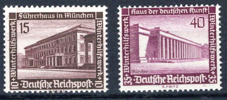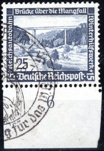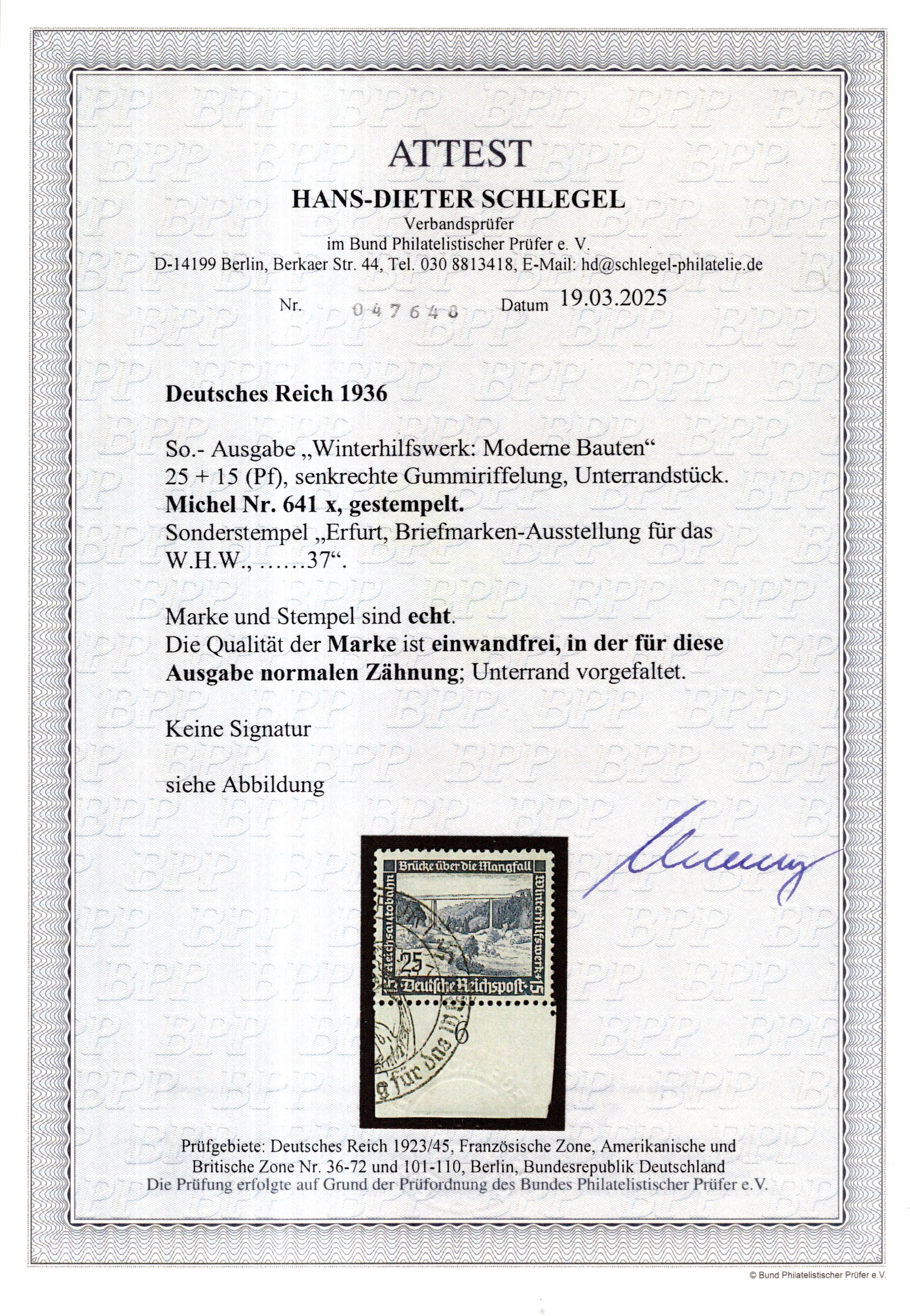 an der Oberkante des Daches, zweite Säule von links", viel markanter als Mi.642I, dazu 640 mit Papierfalte, dadurch zwei senkr. Farbstriche durch "s" von "Winterhilfswerk" (Image)