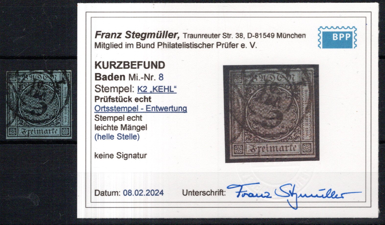 Allseits sehr schön vollrdg. (Mi.+100%) mit Ortsstpl. "Kehl", leichte Schürfung rücks., sonst sehr präsentabel, Fotobefund Stegmüller (Cat Value 1200)