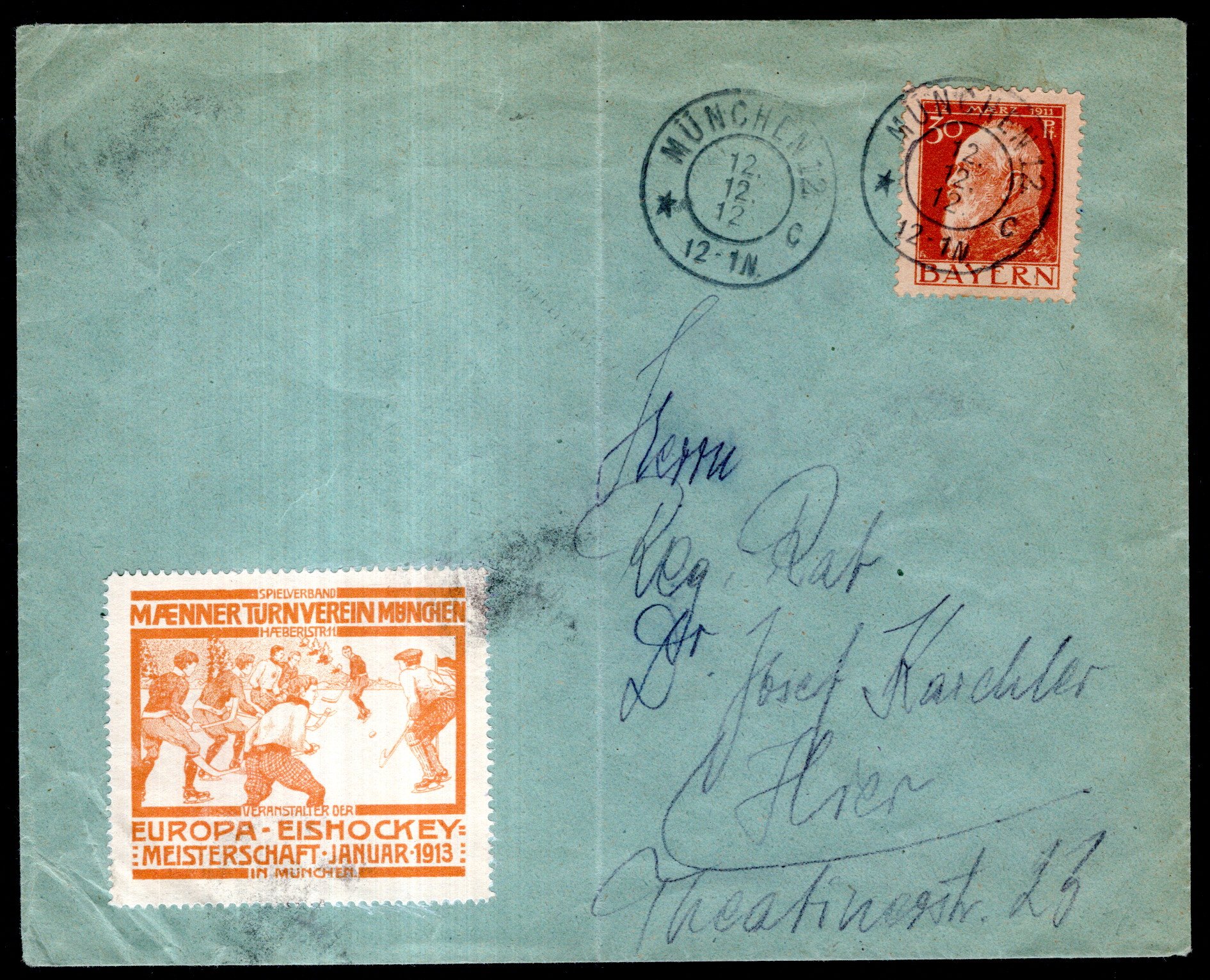 auf Ortsbrief mit gr. Vignette "Maenner Turnverein München Europa-Eishockey Meisterschaft Januar 1913, Beleg einmal gefaltet (Image)
