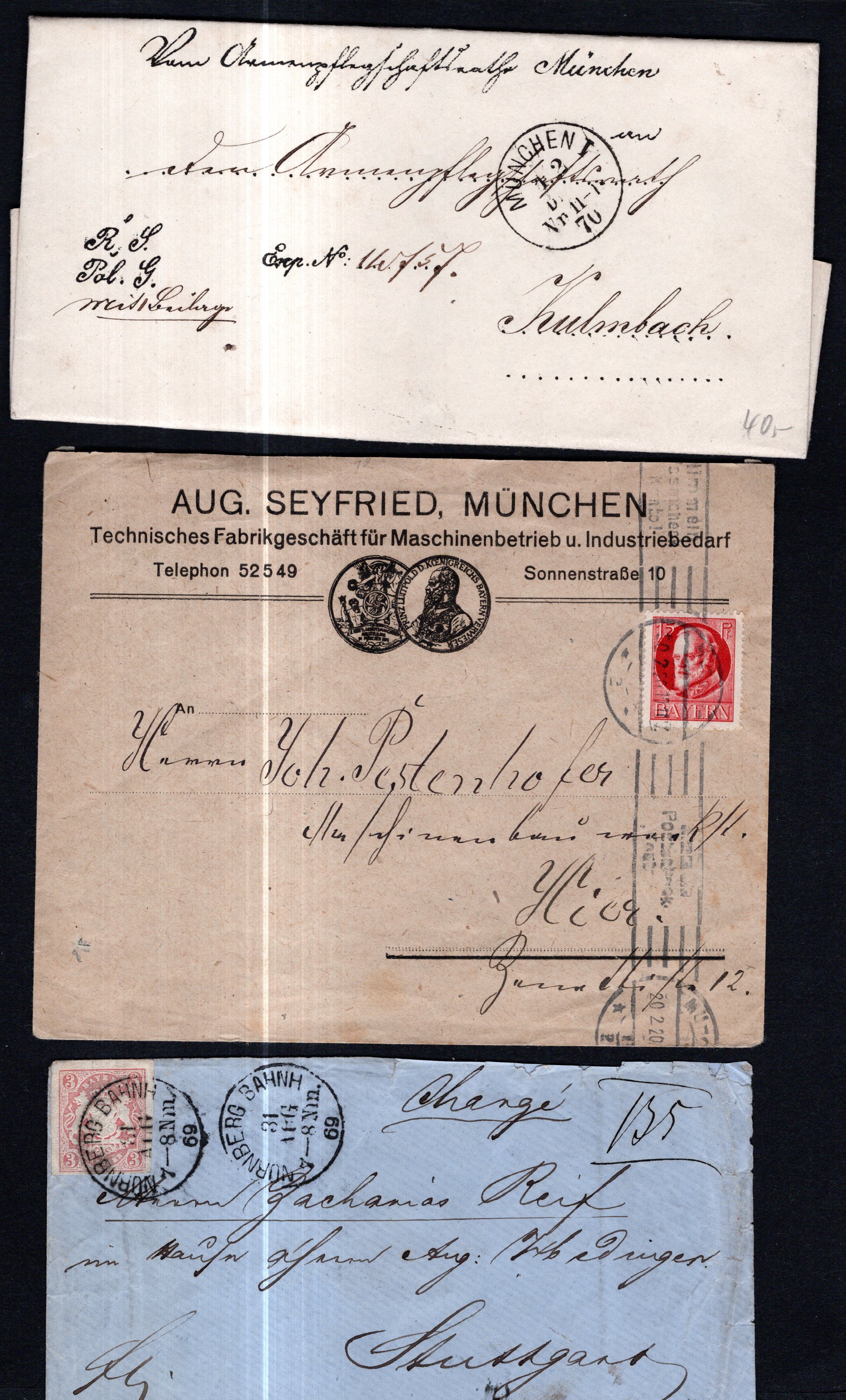 v. 34 Belegen, dabei 115Ab gepr. Helbig, Gzs. A9 ungebr., Militaria Brief München-Kulmbach, dekorat. Brief des Armen Pflegschafts-Rath München etc., Fundgrube