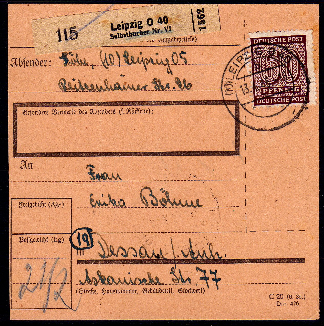 auf Paketkarte v. Leipzig nach Dessau (Ank.Stpl.), Karte mit senkr. Bug, sonst einwandfrei (Cat Value 2000) (Image)