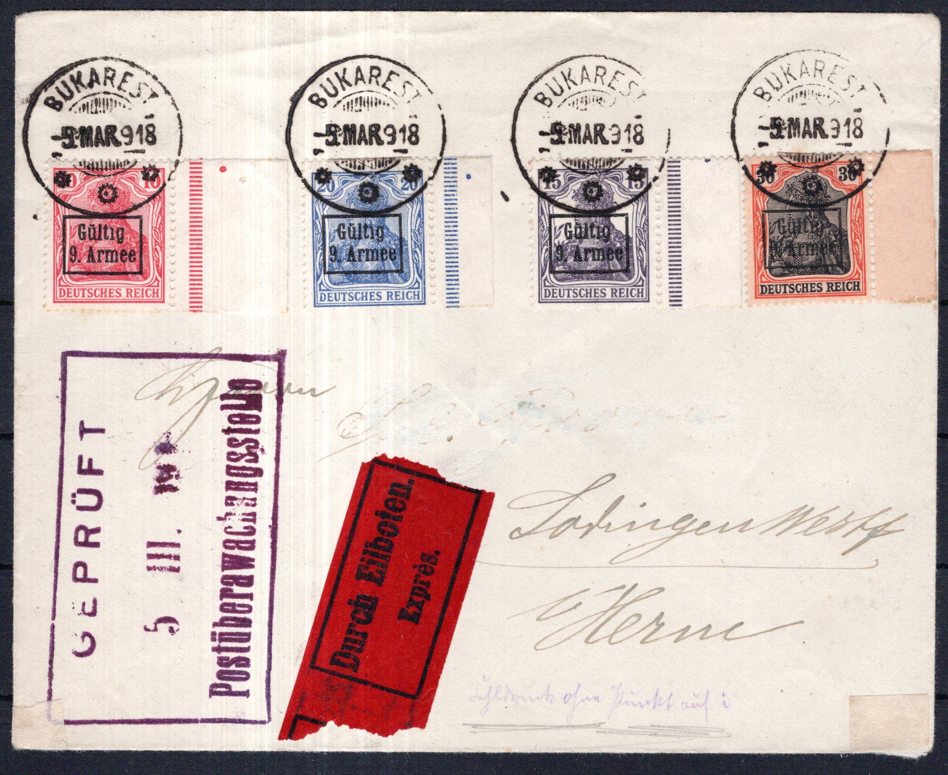 mit rechtem Randst. bzw. Aufdruckfehler "i ohne Punkt" (Mi. mind. +100%) als Eilbotenbrief nach Herne gelaufen, vorders. Zensur-, rücks. Ank.Stpl., Empfänger radiert, sonst einwandfrei (Image)