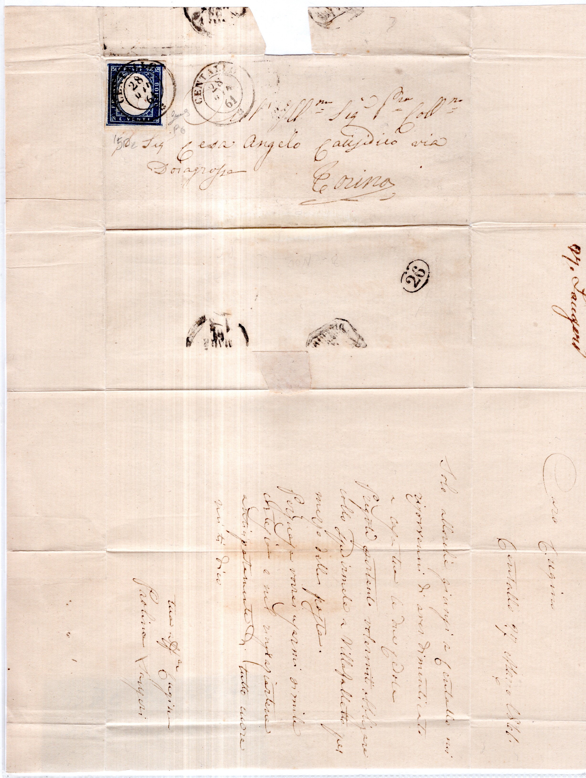 Breitrddg. EF in kobaltblau auf aufgefaltetem Brief von Centallo nach Turin, lt. Fotozertifikat Biondi in allen Teilen original u. in ausgezeichnetem Zustand, Sassone Nr.15Dc =15000.- (Image)