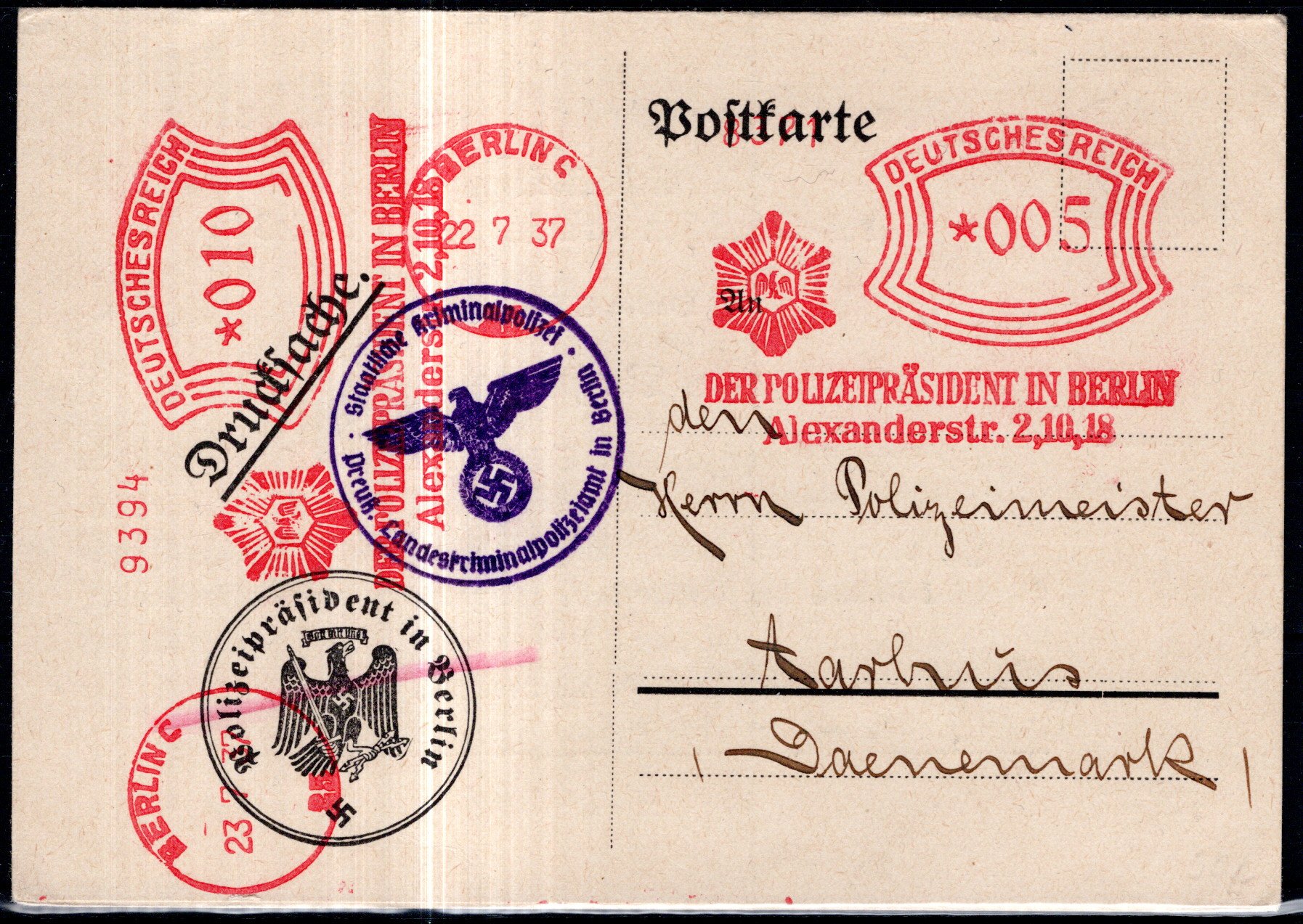 3787 imageZus.Hängend. Frage-/Antwort-Postkarte d. Berliner Polizei a.d. Polizeimeister in Aarhus/Dänemark mit Rechnung über das Dt. Steckbriefregister d. 1. Halbjahres 1937, standartmäßig mit 5Pf Ortsgebühr freigemacht u. mit 10Pf Freistpl. nachfrankt., Rückantwor (Image)