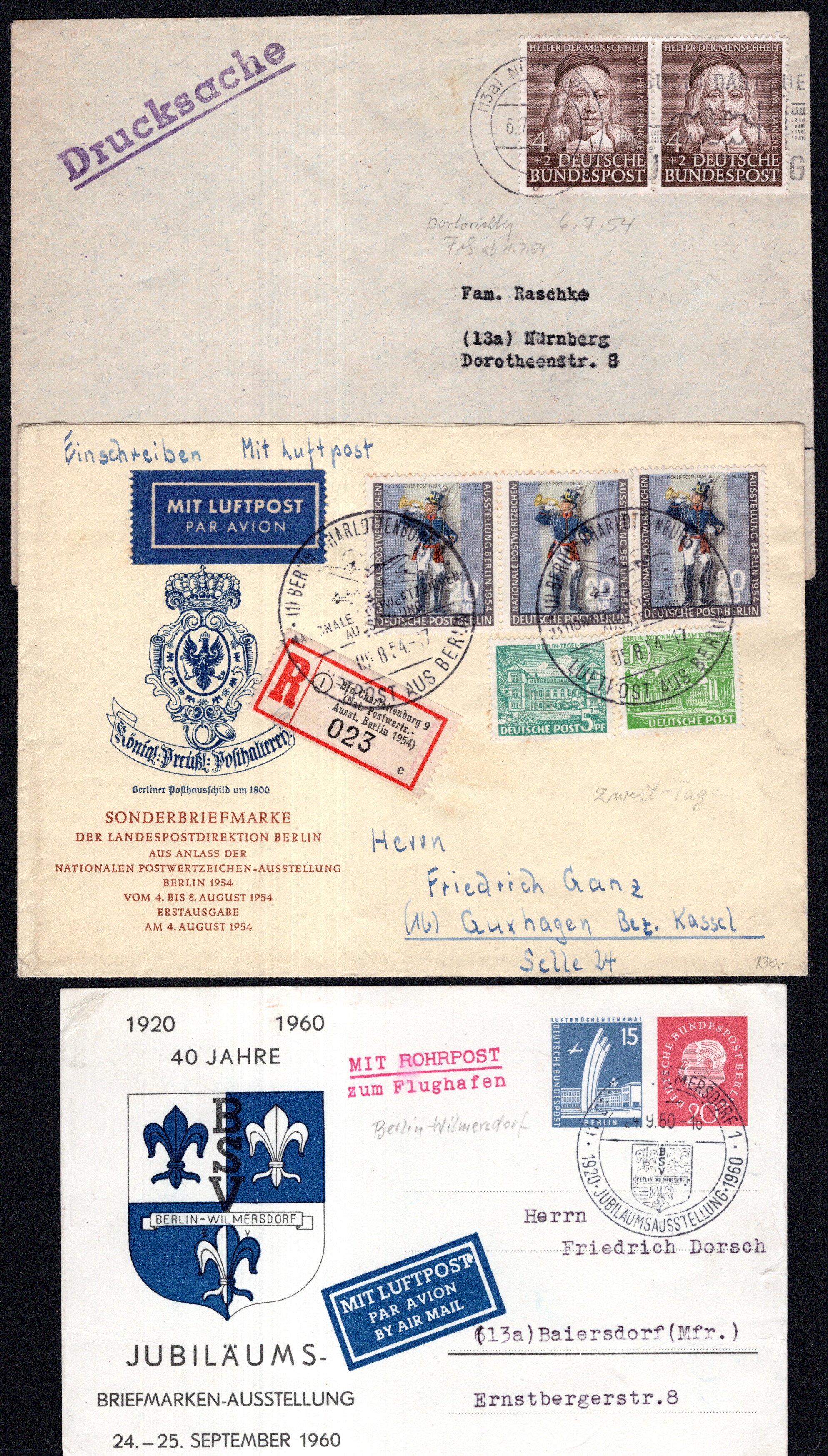 Paar als MeF auf Drucksache, ferner Berlin Bl.4(2) als MeF auf R-Nachnahmebrief, Nr.120 waag. Dreierstreifen plus ZuF auf R-Brief plus 1 Gzs. Heuss III 20Pf