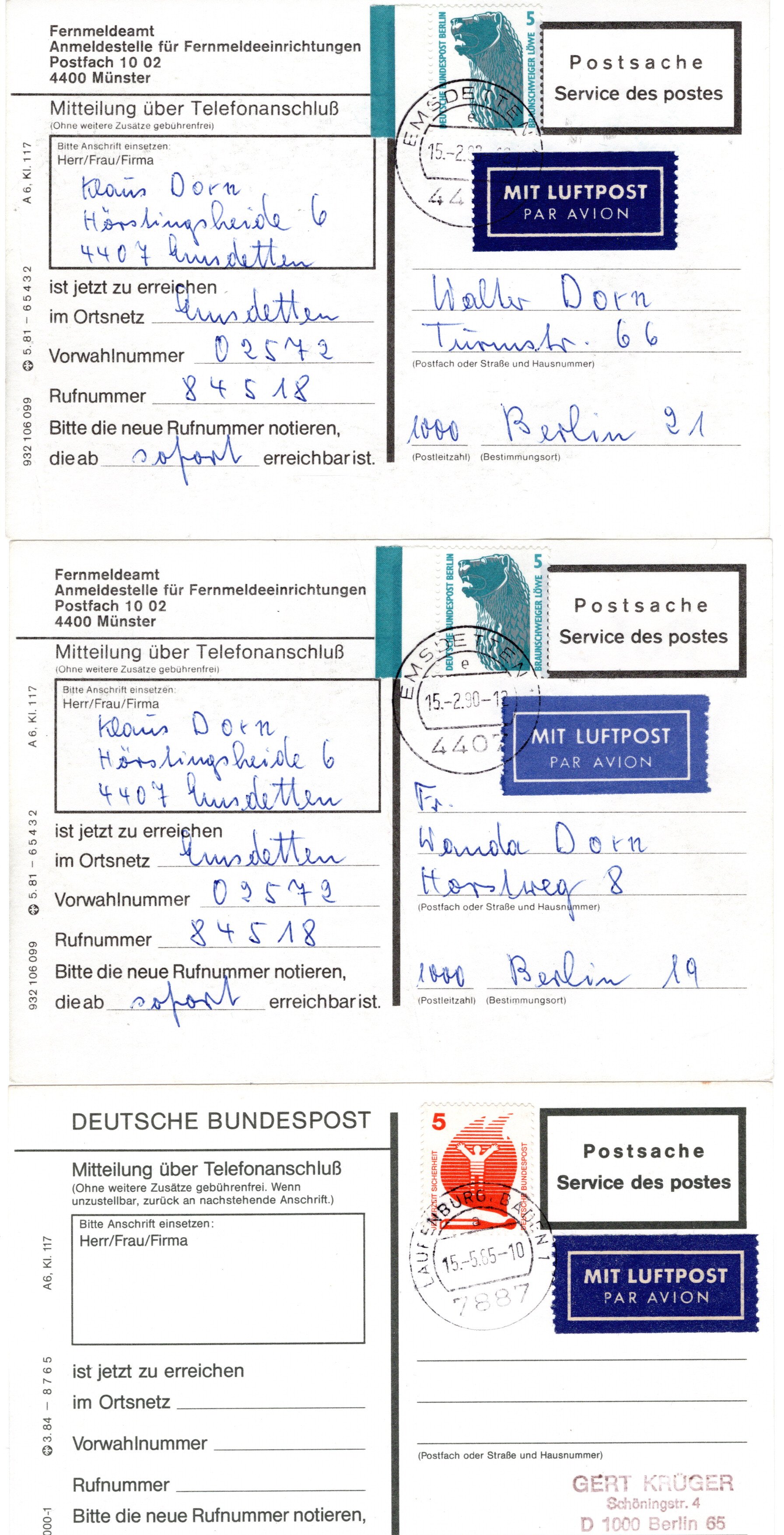 auf Luftpostkarte "Mitteilung über Telefonanschluß, dazu ähnlich Nr.694 sieben adressierte, aber nicht ausgefüllte Karten (Image)