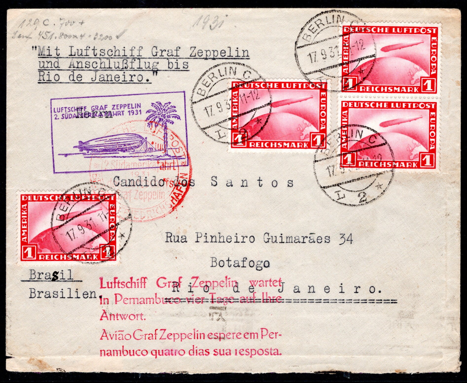 Portger. MeF auf nach Rio de Janeiro der 2.Südamerikafahrt, vorders. drei verschd. Bestätigungsstpl., Bedarf