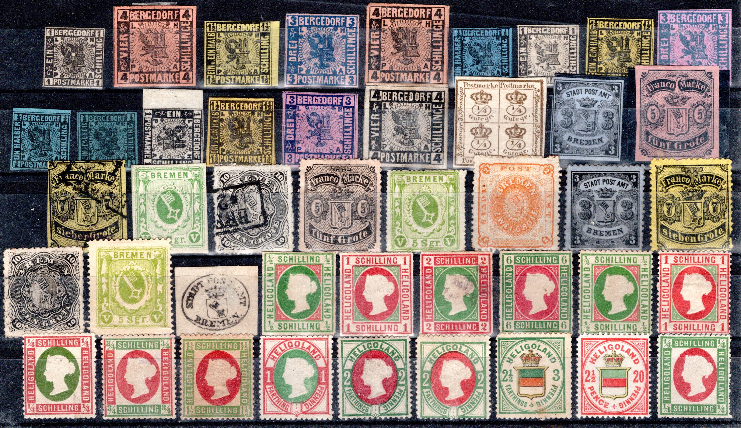 5295 imageBergedorf/Bremen/Helgoland, Steckkarte mit 44 Marken, Echte und Falsche, bitte ansehen (Image)