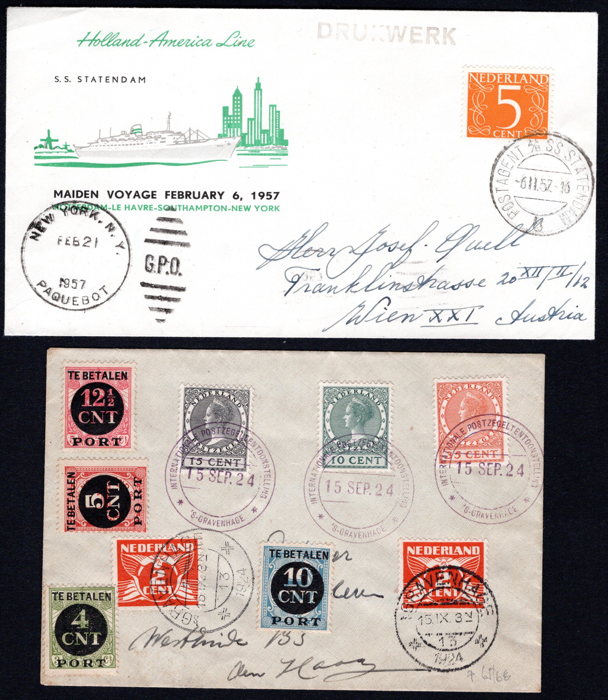 Sonderstpl., dazu P65-68 Stpl. sGravenhage, außerdem Paquetbot-Brief 1957 nach New York (Image)