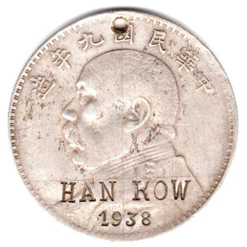 7254 imageChina -Verteidigung von Hankow 1938, sog. "Fat Man Dollar" mit entsprechd. Prägung als Dankesmedaille an Angehörige der Royal Navy, leicht berieben mit Loch für das Ordensband (Image)