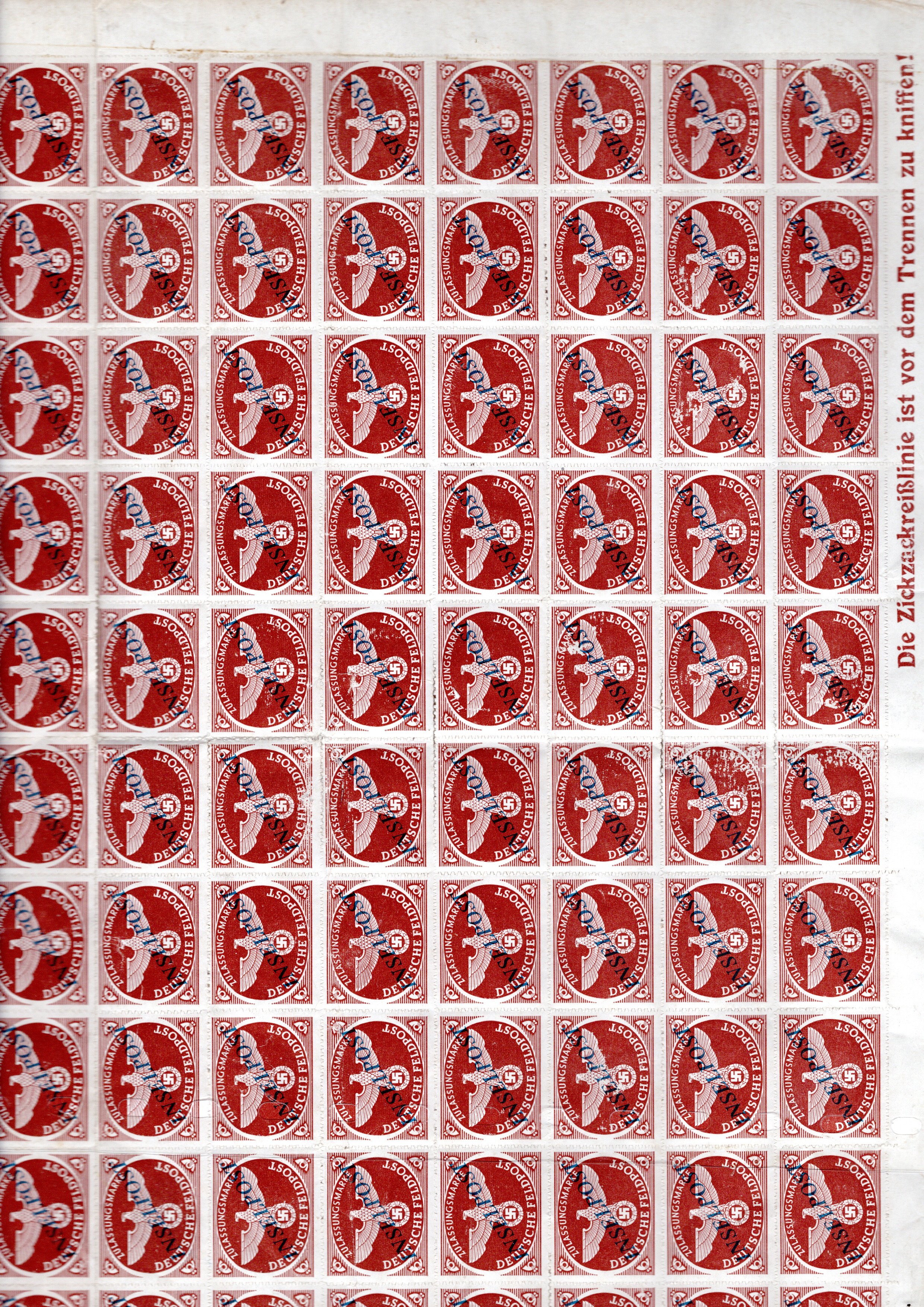 Originalbogen, etwa die Hälfte der Marken Ablagespuren, Anhaftungen bzw. einige Werte hell, teils Randmängel, Eckrandst. mit HAN O.K., kpl. Bogen überaus selten!
