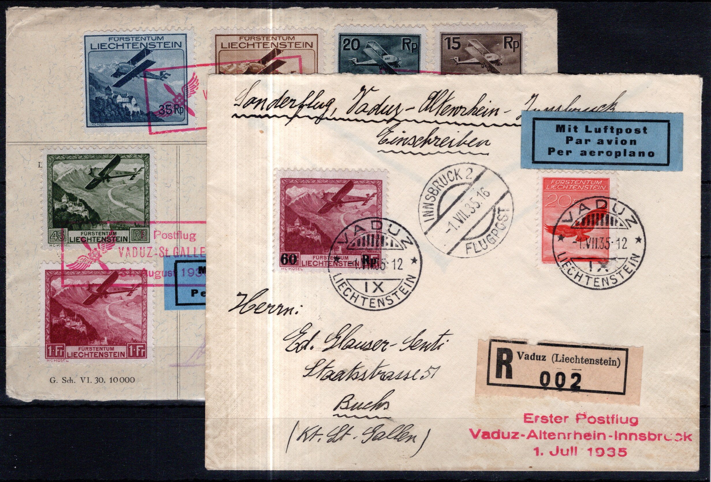 Satz-R-Brief vom 1.Postflug Vaduz-St.Gallen nach Wien, dazu 145 u. 148 zusammen auf R-Brief 1.Postflug Vaduz-Altenrhein-Innsbruck, rücks. je Ank.Stpl., Pracht, Mi. f. 470.- (Image)