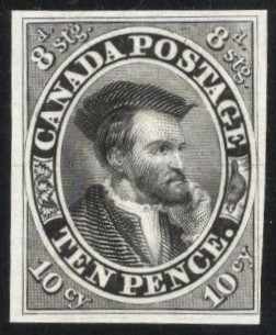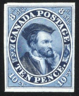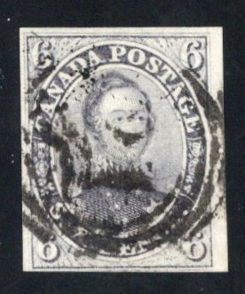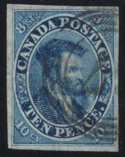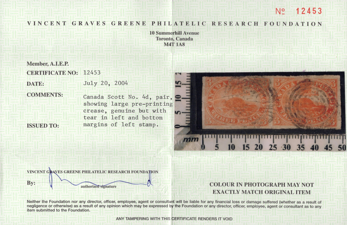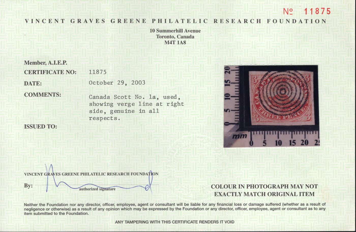 Beaver Imperforate, on Laid Paper, used with neat concentric ring cancel, showing strong laid lines plus a verge line at right. A nice example of Canada's first stamp, with four large margins, very fine. Accompanied by a 2003 Greene Foundation