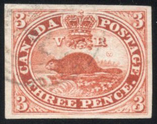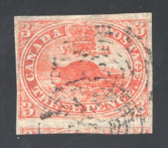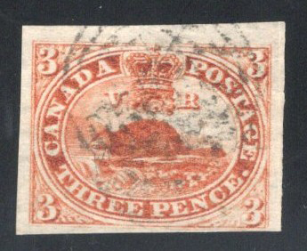 Beaver Imperforate, on Wove Paper, used with a light target cancel and bright colour. Four large to huge margins, showing part of adjoining stamp at right and bottom. Tiny bit of toning spot at bottom, at outer edge of margin, plus a tiny scissor