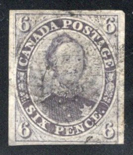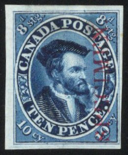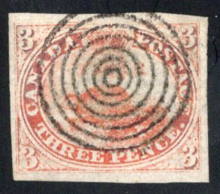 Cartier Imperforate on Thin, Crisp Paper, used with a neat 4-ring numeral cancel (likely #27 from Ottawa), with four large margins. The stamp has a few pressed-out creases and a tiny corner crease at top right corner (outside of design), still