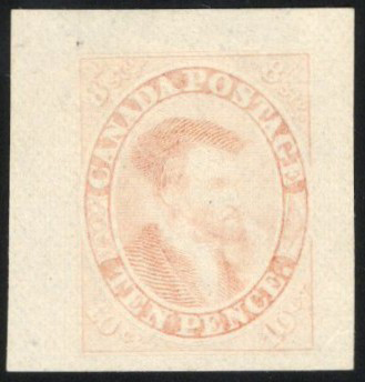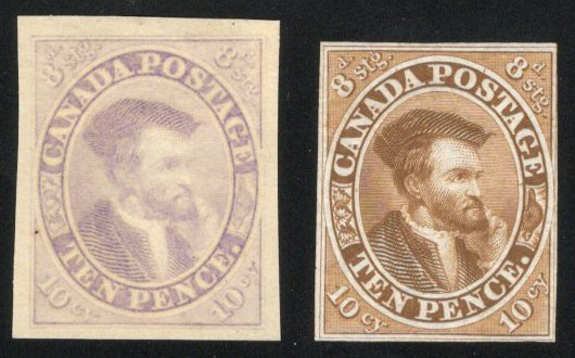 Trade Sample Proof in Two Shades, both printed on thin wove paper, with one in lilac (large margins, hr and pinpoint spot on front) and one in brown (margins well clear to just touching).