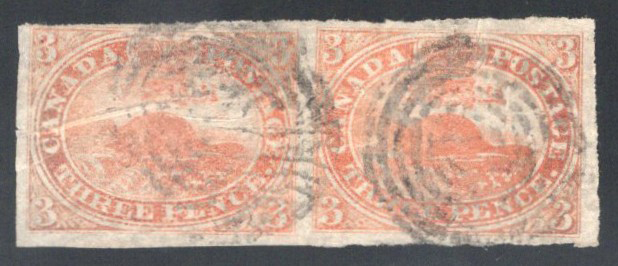 Beaver Imperforate, on Thin Paper, with Pre-Printing Paper Fold, a used horizontal pair with concentric ring cancels, showing a prominent natural pre-printing paper fold on the left stamp. Small tear in margin at left (at end of fold) and at