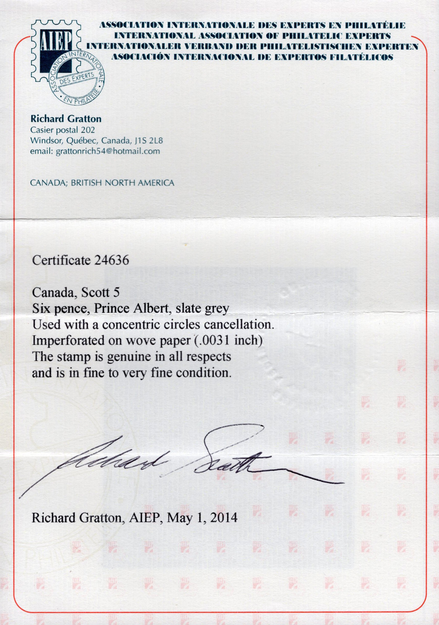 Consort Imperforate, on Wove Paper, used with bold 4-ring numeral cancel, three large margins plus just touching at bottom, fine. Accompanied by a 2014 Richard Gratton certificate. (Scan 1)